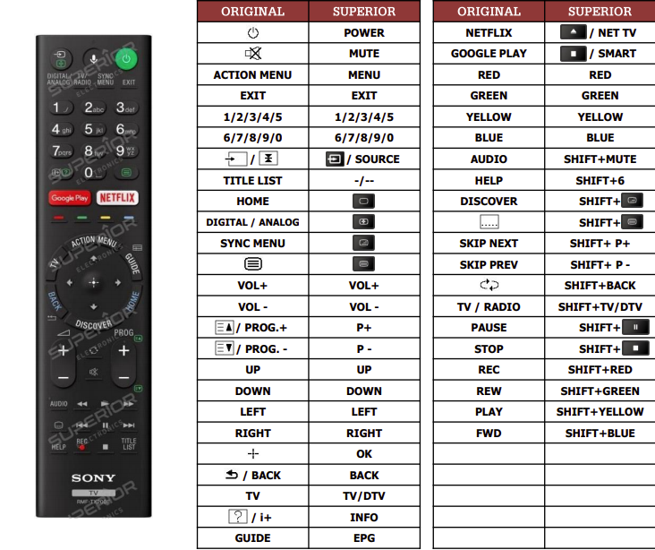 Náhradou za originální dálkový ovladač Sony k tomuto přístoji je značkový ovladač EMERX PReDATOR (vpravo), který má jiný vzhled (barvu, rozložení tlačítek apod.), ale stejné funkce jako originální ovladač Sony. Dálkový ovladač EMERX PReDATOR nabízíme jako levnější alternativu k originálnímu ovladači nebo proto, že se již tento originální ovladač nevyrábí. Námi zaslaný ovladač nemusíte nijak programovat. Bude nastaven přesně pro váš přístoj Sony, se zachováním všech funkcí.