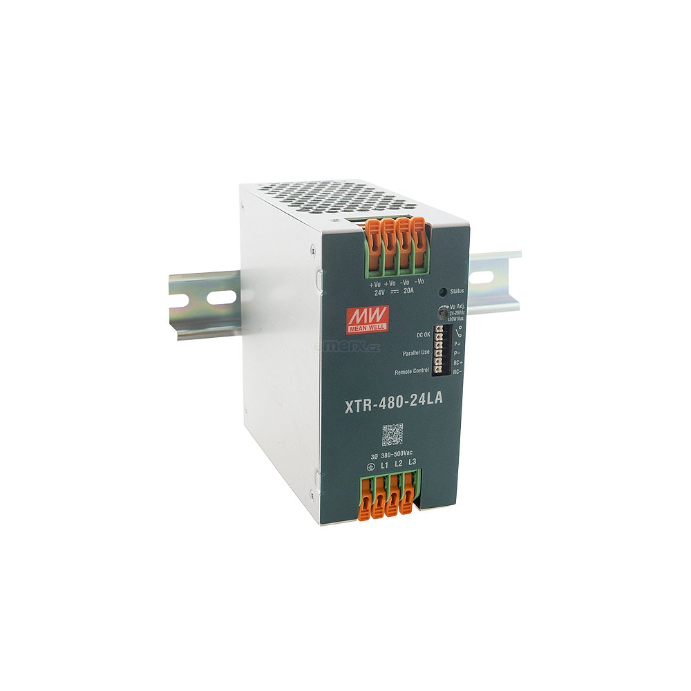 Spínaný zdroj na DIN lištu, 3 fázový, 480W, 24V/20A DC s páčkovou svorkovnicí