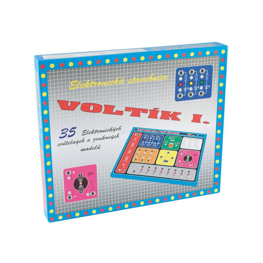 Stavebnice Voltík umožňuje sestavit podle jednoduchých návodů nejméně 35 elektronických modelů bez pájení s barevnými světélky a tónovým bzučákem. (VOLTÍK I.)