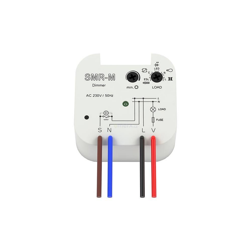 Určen pro stmívání:- stmívatelných LED žárovek- stmívatelných úsporných žárovek- umožňuje plynulé nastavení intenzity světla tlačítkem nebo tlačítky paralelně- při vypnutí se nastavená úroveň jasu uloží do paměti a při opětovném zapnutí je jas nastaven již na tuto hodnotu- typ světelného zdroje (LED nebo stmívatelná úsporná žárovka) se nastavuje přepínačem na panelu přístroje- nastavení minimálního jasu potenciometrem na panelu přístroje eliminuje blikání různých typů úsporných žárovek - napájecí napětí 230V AC