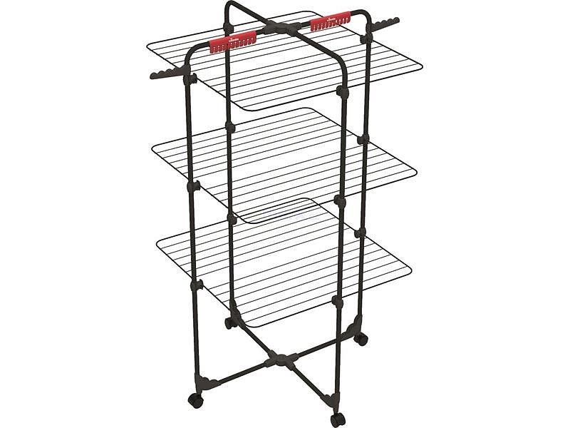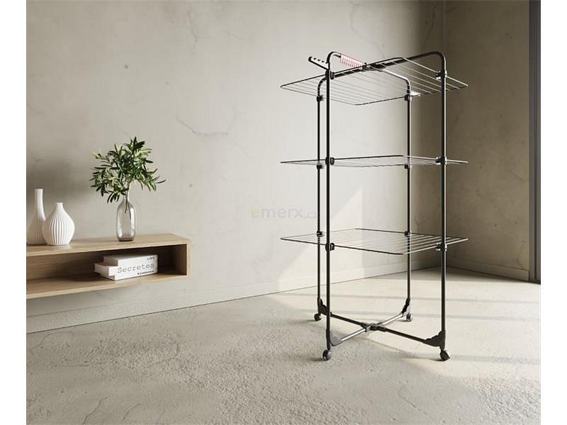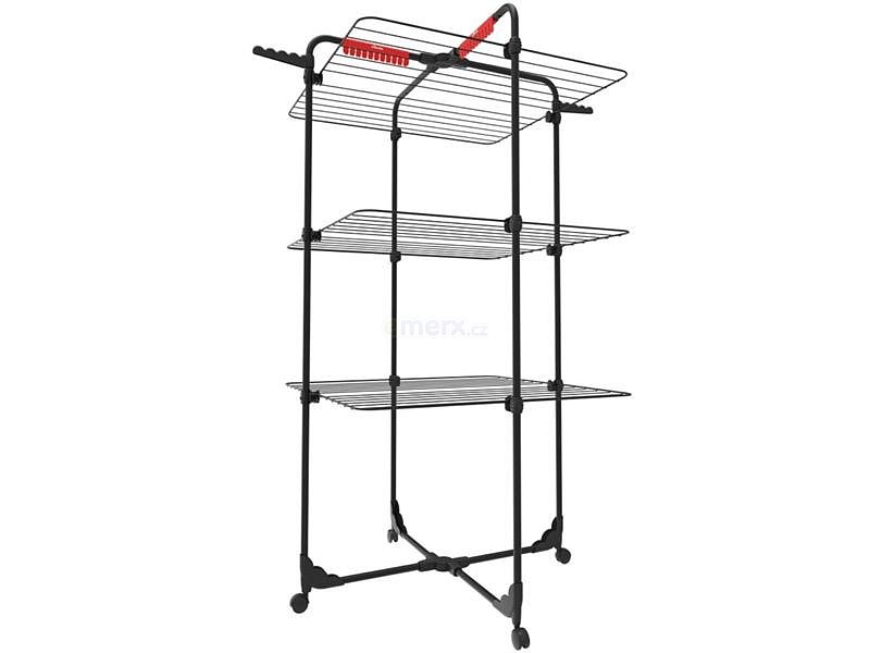 Ocelový tříúrovňový sušák na prádlo, velmi všestranný a flexibilní. Díky nezávislým roštům, kteté mohou být použity otevřeně pro např. sušení dlouhých oděvů, nebo polosloženě a přisunuté např. u radiátoru, skvěle šetří místo. Dodatečné sušící místo lze získat použitím držáku pro malé oděvy, jako jsou ponožky nebo spodní prádlo. Lze využét též 2 věšáky pro ramínka. Otočná kolečka pro snadné přemsťování. Lze kompaktně složit a skladovat. Díky speciálnímu kloubu lze využívat polovinu nebo plnou plochu sušáku. I při minimálních nárocích na prostor nabízí 30 metrů sušící plochy. Má 8 nezávislých roštů vhodných pro sušení dlouhých oděvů nebo delikátního prádla a s držákem pro malé oděvy, 2 věšáky pro ramínka a otočnými kolečky pro snadné přemisťování.