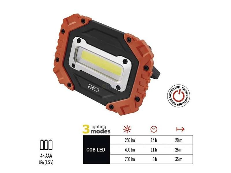 COB LED pracovní svítilna P4113, 700 lm, 4×AA. Ať už ve dne, v noci nebo za šera, s touto svítilnou budete mít světla vždy akorát. Díky třem módům si nastavíte intenzitu svícení přesně takovou, jakou právě potřebujete. I když se svítilna napájí pomocí 4 baterií AA, svým vysokým světelným tokem až 700 lm skvěle konkuruje těm síťově napájeným.
