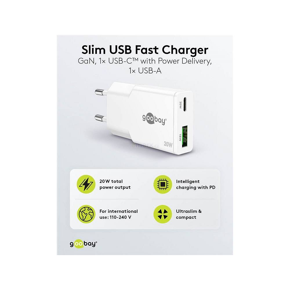 Tenká duální rychlonabíječka USB-C™ PD GaN (20 W), Bílá