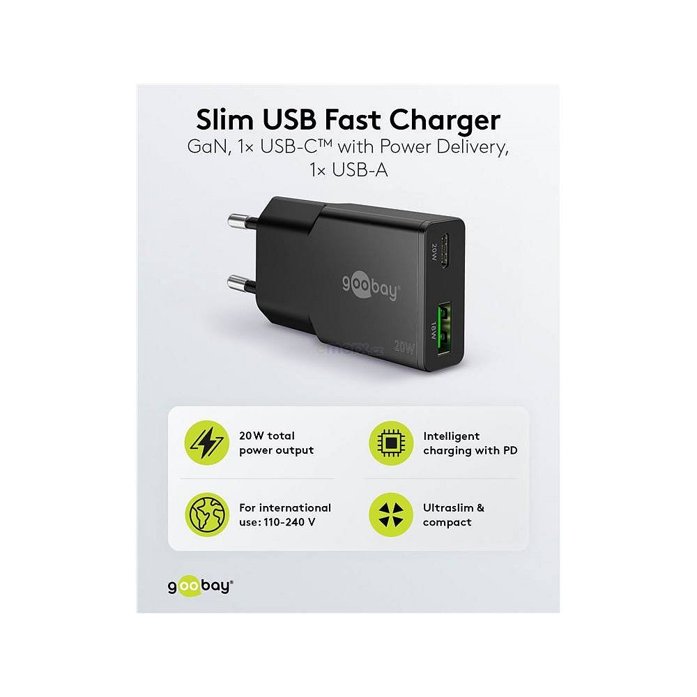 Tenká duální rychlonabíječka USB-C™ PD GaN (20 W), černá