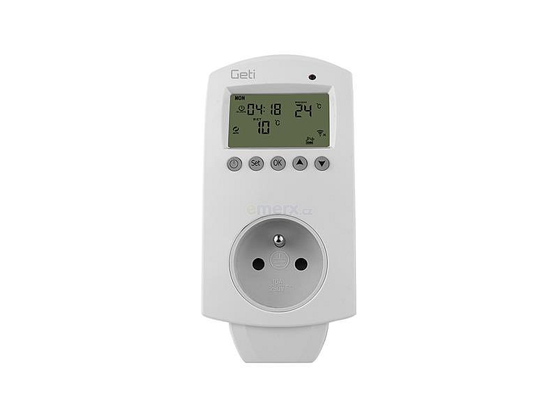 Zásuvkový termostat GETI GRT07 je ideálním řešením pro snadné a bezpečné připojení elektrických spotřebičů s topným tělesem, jako jsou přímotopy, elektrické radiátory nebo ohřívače, které nelze připojit běžným způsobem k termostatu. Termostat řídí napájení připojeného zařízení přes výstupní zásuvku podle nastaveného programu a umožňuje tak komfortní a energeticky úsporné ovládání teploty.