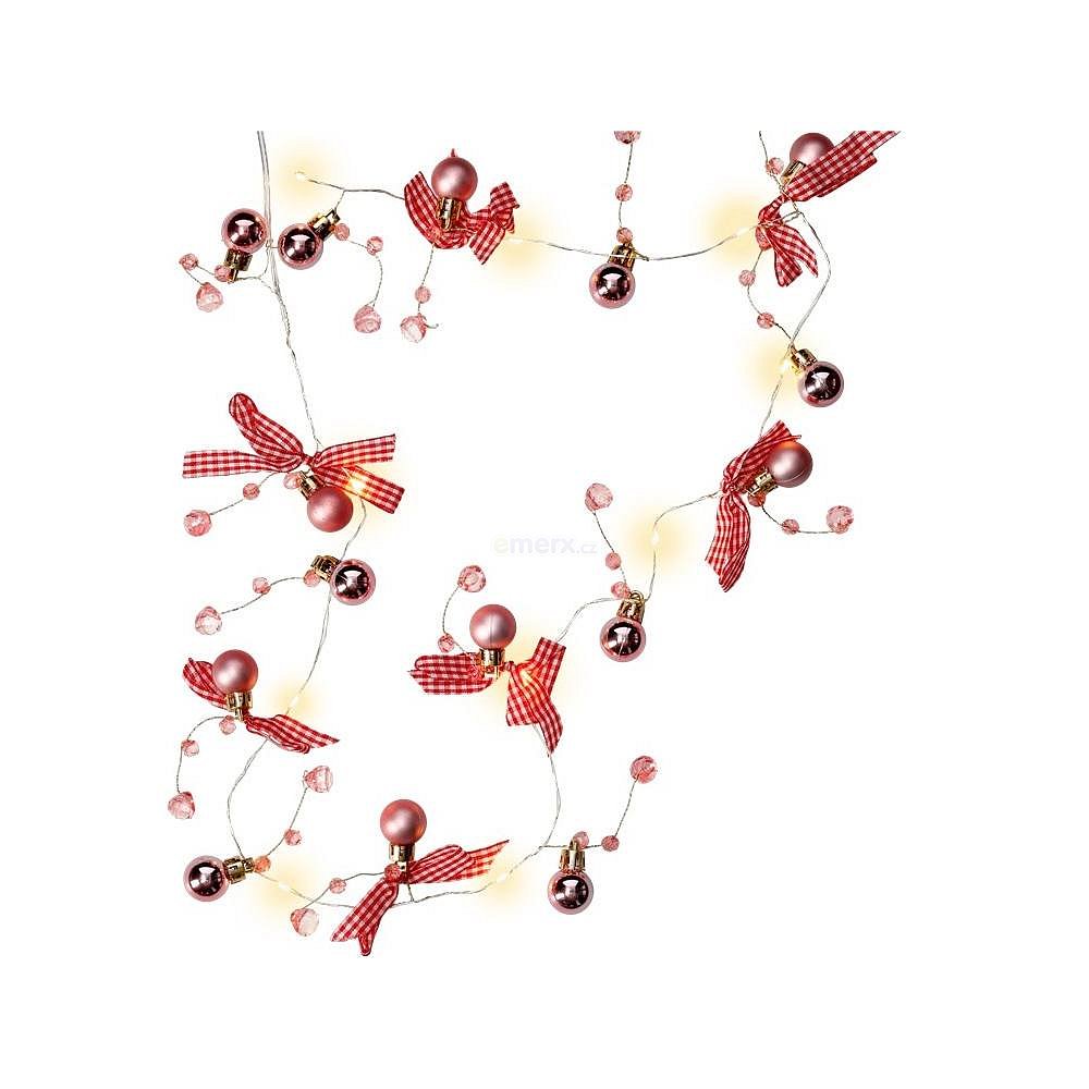 Vánoční řetěz s 10 LED diodami, kuličky, stuhy a krystaly; teplé bílé světlo; bateriové napájení (2xAA); vnitřní použití