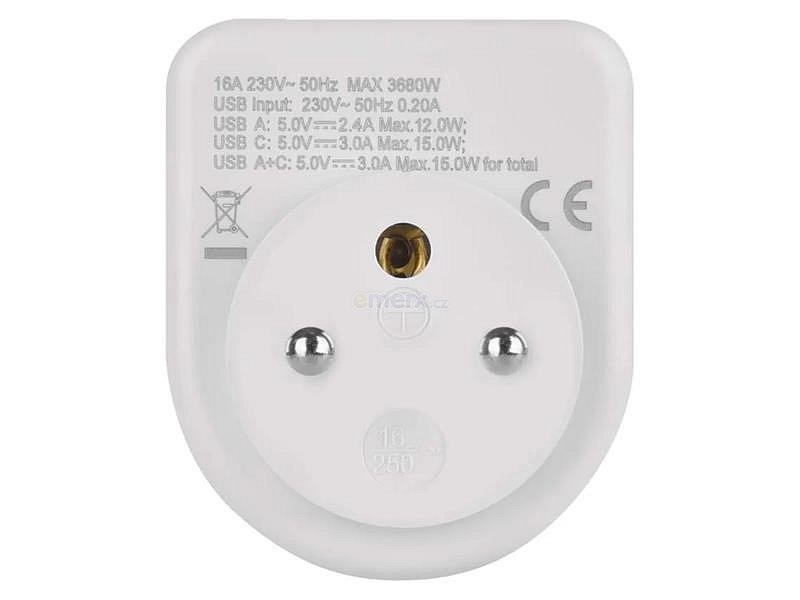 Kvalitní adaptér s 1 zásuvkou a 2 USB konektory. Maximální zatížení 3 680 W (250 V, 16 A) umožňuje připojení několika zařízení ve vnitřním prostředí.
