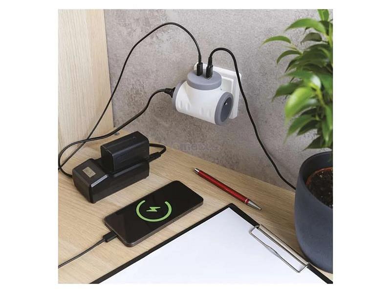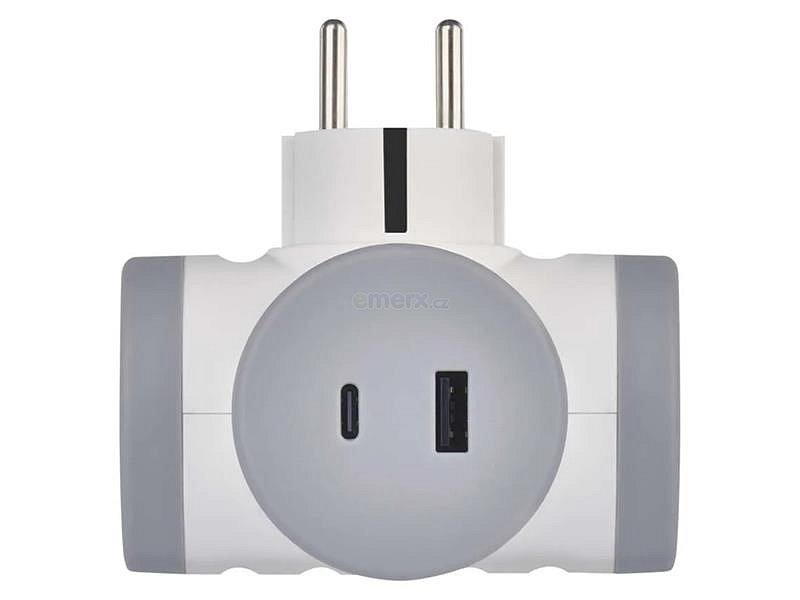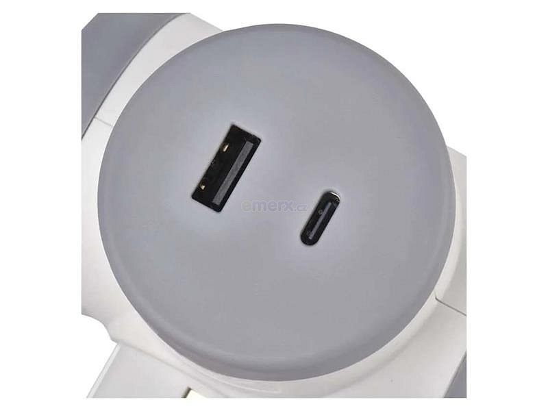 Rozbočovací zásuvka 2×, 1×USB-A+1×USB-C, bílo-šedá. Kvalitní adaptér se 2 zásuvkami a 2 USB porty. Maximální zatížení 3 680 W (250 V, 16 A) umožňuje připojení několika zařízení ve vnitřním prostředí.