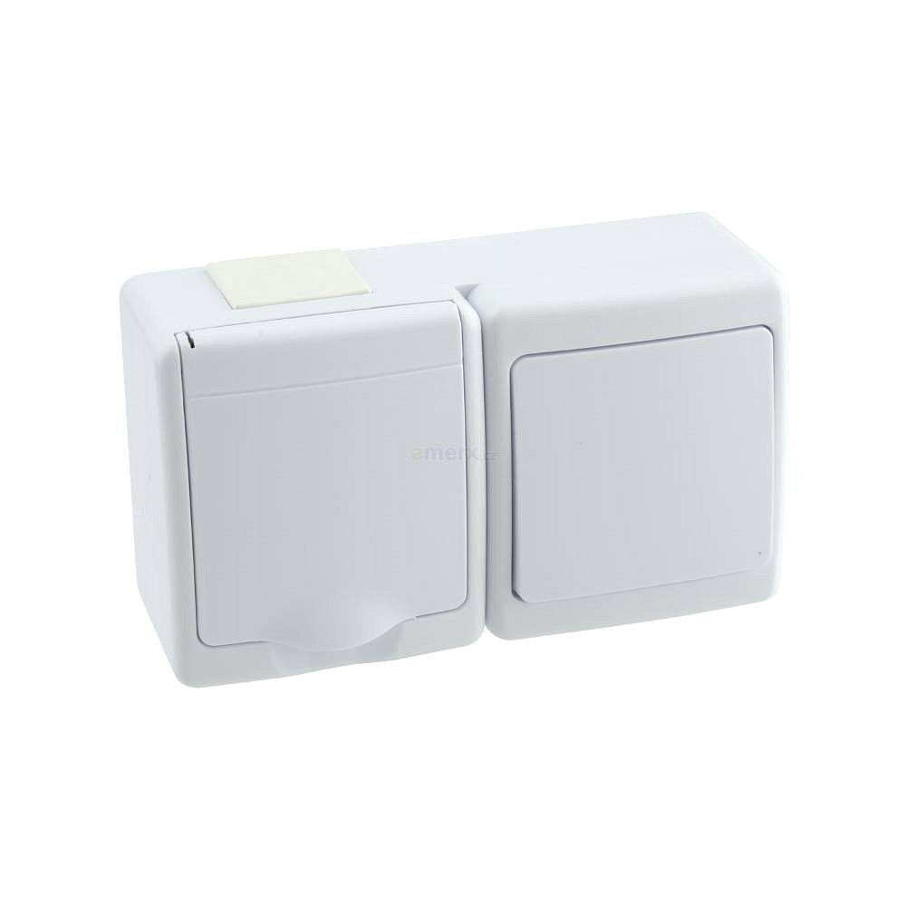 Vypínač jednopólový, řazení 1, IP44 s bílou zásuvkou IP44.Napětí 230VProud vypínače 10AProud zásuvky 16A