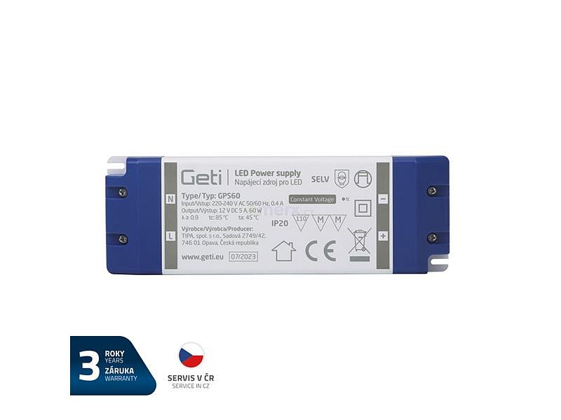 Na tento výrobek poskytujeme 3 roky záruku. Spínaný zdroj konstantního napětí GETI GPS60, s výstupním napětím 12V, který je vhodný pro napájení LED pásků.