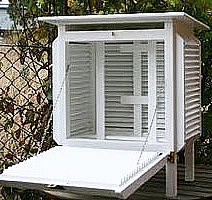 V této nebo podobné skříňce jsou čidla schovány před slunečním zářením a lamelové stěny zároveň nebrání proudění vzduchu. V našich podmínkách bude problém takovou skříňku koupit, ale český kutil si něco podobného dokáže vyrobit :-). Případně lze dodržet pouze základní požadavky. To znamená umístit čidlo na místo, kde je stín a kde proudí vzduch (pod stříšku, stůl atd.)